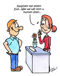 Een luchtige cartoon voor een 'zwaar' onderwerp. Patiëntenorganisatie Kansplus wilde een cartoon voor de omslag van een brochure over wat 'Kwaliteit van leven' nou precies is voor een patiënt. Met andere woorden: waar wordt iemand gelukkig van? Als patiënt is het handig om daar zelf ook over na te denken. Vandaar de brochure, met mijn tekening op de voorkant.
